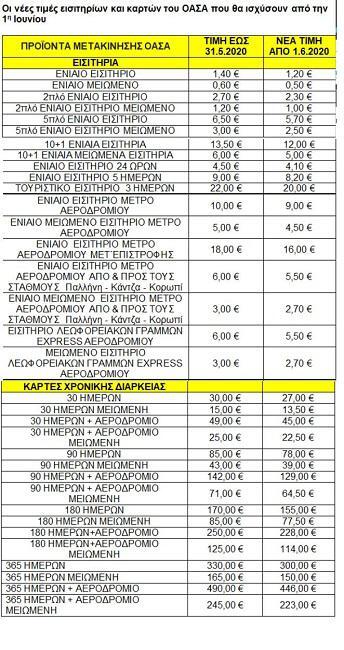 Στην Αθήνα η τιμή του βασικού εισιτηρίου του ΟΑΣΑ ορίζεται στο 1.20 ευρώ αντί για 1.40 που ισχύει έως σήμερα – δηλαδή στρογγυλοποιείται προς τα κάτω και πέραν του ποσοστού μείωσης του Φ.Π.Α. Υπενθυμίζεται ότι το μεμονωμένο εισιτήριο είχε αυξηθεί στο 1,40 ευρώ μετά το 2015.