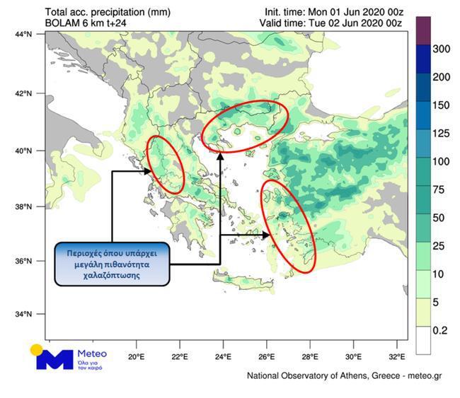 Μεγάλη είναι η πιθανότητα χαλαζοπτώσεων στο Αιγαίο, την Κεντρική και Ανατολική Μακεδονία, τη Θράκη και γενικότερα στα ορεινά της κεντρικής και βόρειας ηπειρωτικής χώρας. Οι καταιγίδες αναμένεται να είναι κατά τόπους ισχυρές και θα συνοδεύονται από ενισχυμένους ριπαίους ανέμους και έντονη κεραυνική δραστηριότητα.