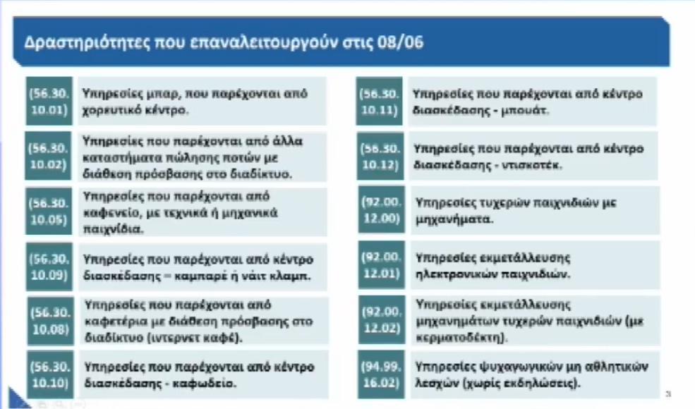 Παράλληλα στις 8 Ιουνίου ανοίγουν, μεταξύ άλλων, internet cafe, χορευτικά κέντρα, κέντρα διασκέδασης, μπουάτ