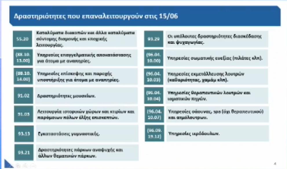 Στις 15 Ιουνίου ανοίγουν, μεταξύ άλλων, γυμναστήρια, καταλύματα διακοπών εποχικής λειτουργίας, ιαματικά λουτρά και SPA ενώ στις 29 Ιουνίου ανοίγουν οι κατασκηνώσεις που φιλοξενούν παιδιά.