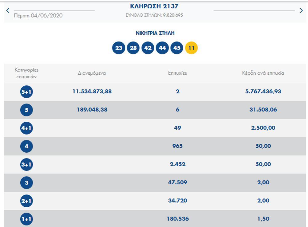 Οι τυχεροί αριθμοί στην σημερινή κλήρωση Τζόκερ είναι οι εξής: 23, 28, 42, 44, 45 και Τζόκερ ο αριθμός 11 .