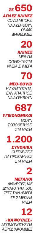 Σύμφωνα με πληροφορίες του Ελεύθερου Τύπου της Κυριακής, στα νοσοκομεία των νησιών υπάρχουν διαθέσιμες 440 απλές κλίνες Covid, οι οποίες δύνανται να αυξηθούν και να ξεπεράσουν ακόμη και τις 650. Επιπλέον, σήμερα είναι διαθέσιμες περίπου 20 κλίνες ΜΕΘ-Covid στα νησιά και μπορούν να ξεπεράσουν τις 70, εάν απαιτηθεί. Ο σχεδιασμός του υπουργείου Υγείας είναι δυναμικός, θα προσαρμόζεται δηλαδή στις ανάγκες που θα προκύψουν και αναλόγως με τον βαθμό διασποράς του Sars-CoV-2 από «εισαγόμενα» κρούσματα.