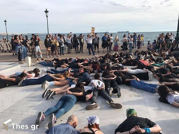 Οι νέοι κρατούσαν πανό και χαρτόνια με συνθήματα κατά του ρατσισμού, ενώ μάλιστα σε μια συμβολική κίνηση που προκάλεσε εντύπωση ξάπλωσαν στο έδαφος, παίρνοντας τη θέση του Φλόιντ, όπως αυτός άφησε την τελευταία του πνοή στη Μινεάπολη.