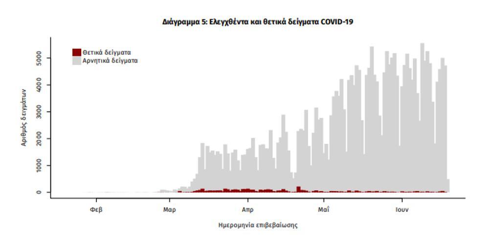 Δείγματα που έχουν ελεγχθεί στα συνεργαζόμενα με τον ΕΟΔΥ εργαστήρια: Από την 1η Ιανουαρίου 2020 μέχρι σήμερα, στα εργαστήρια που διενεργούν ελέγχους για τον νέο κορωνοϊό (SARS-CoV-2) και που δηλώνουν συστηματικά στον ΕΟΔΥ το σύνολο των δειγμάτων που ελέγχουν (θετικά και αρνητικά), έχουν συνολικά ελεγχθεί 274.711 κλινικά δείγματα, εκ των οποίων τα 5.265 (1.9%) ήταν θετικά στον κορωνοϊό (συμπεριλαμβάνονται και περισσότερα από ένα δείγματα ανά άτομο που ελέγχθηκε).