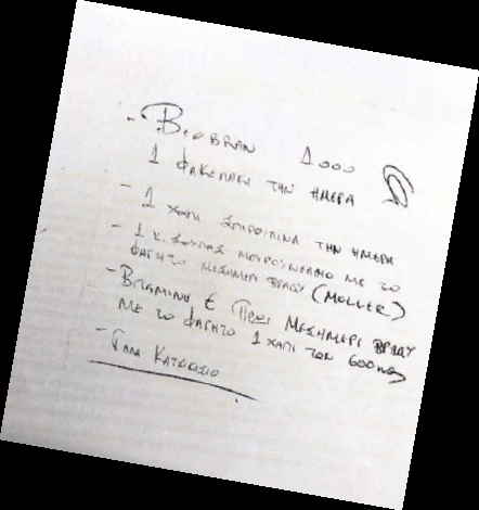 3 χάπια μουρουνέλαιου, 1 χάπι γαϊρουράγκαθου, 1 χάπι ΜΣΜ (συμπλήρωμα διατροφής) και ένα χάπι γκραβιόλας («πολεμιστής του καρκίνου»)