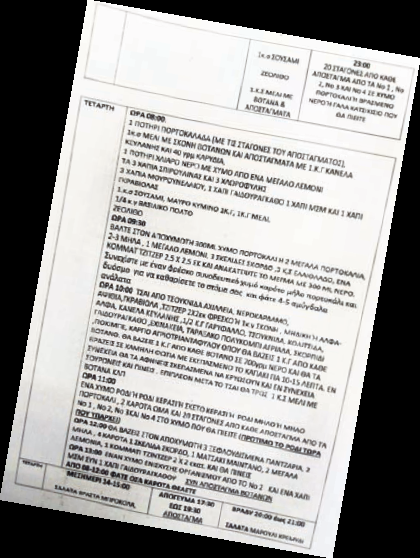Για τις 12:00 έδινε οδηγίες: Θα βάζεις στον αποχυμωτή 3 ξεφλουδισμένα παντζάρια, 2 μήλα, 4 καρότα, 1 σκελίδα σκόρδο, 1 ματσάκι μαϊντανό, 2 μεγάλα λεμόνια, 1 κομμάτι τζίντζερ, 2Χ2 εκατοστά και θα πίνεις. Στις 13:00 έδινε: Εναν χυμό ενίσχυσης οργανισμού από το Νο 2 και ένα χάπι ΜΣΜ (συμπλήρωμα διατροφής), 1 χάπι γαϊδουράγκαθου συν απόσταγμα βοτάνων.