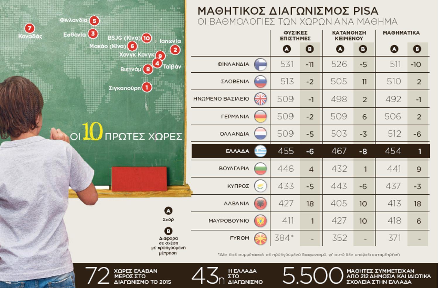 Ιδιαίτερη εντύπωση προκαλεί η παρατήρηση που γίνεται από την Εθνική Διαχειρίστρια PISA, κ. Χρύσα Σοφιανοπούλου, σχετικά με τις επιδόσεις της χώρας. Οπως σημειώνει, στις Φυσικές Επιστήμες, η Σιγκαπούρη που βρίσκεται στην πρώτη θέση είχε διαφορά σε σχέση με την Ελλάδα 101 μονάδες στο σκορ. Σύμφωνα με εκτιμήσεις, κάθε 38 μονάδες αντιστοιχούν σε ένα χρόνο φοίτησης. Βάσει αυτών, οι 15χρονοι στη Σιγκαπούρη υπερτερούν κατά 2,5 χρόνια επιπλέον χρόνων φοίτησης από τους συνομήλικους Ελληνες.