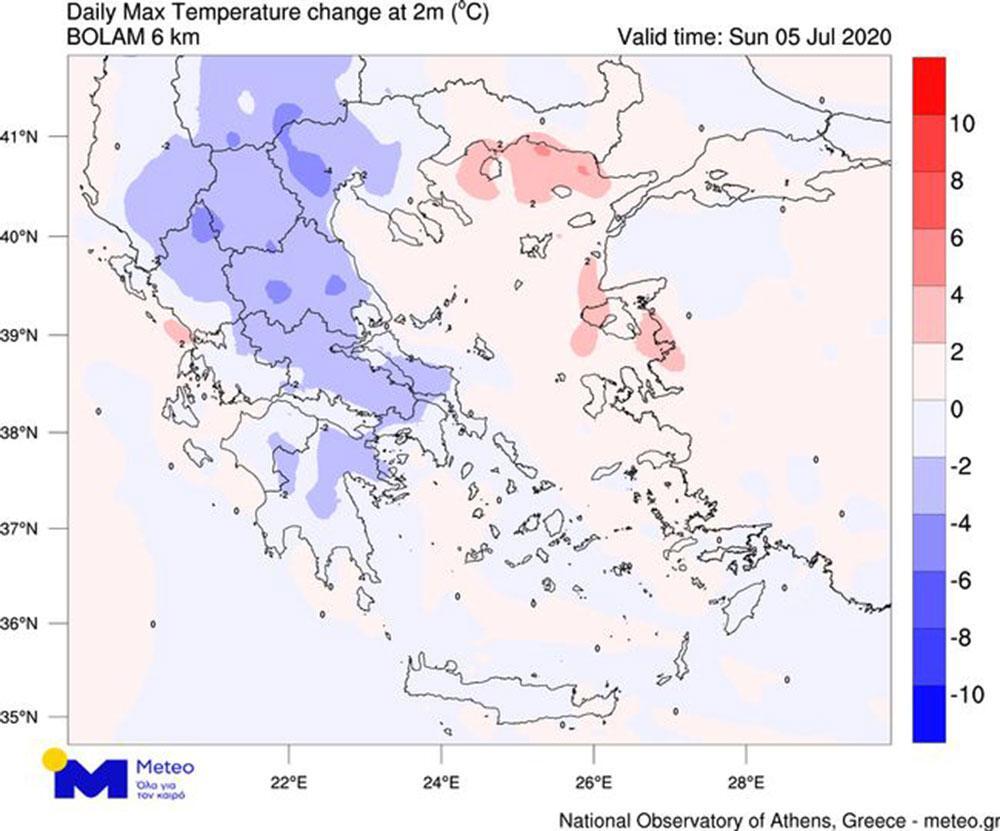 Η θερμοκρασία αύριο, Κυριακή, θα παρουσιάσει μικρή πτώση, κυρίως στις περιοχές εκδήλωσης φαινομένων, και δεν θα ξεπερνά τους 34-36 βαθμούς ενώ μόνο στα νησιά του Ανατολικού Αιγαίου θα φτάσει τοπικά τους 37-38 βαθμούς.