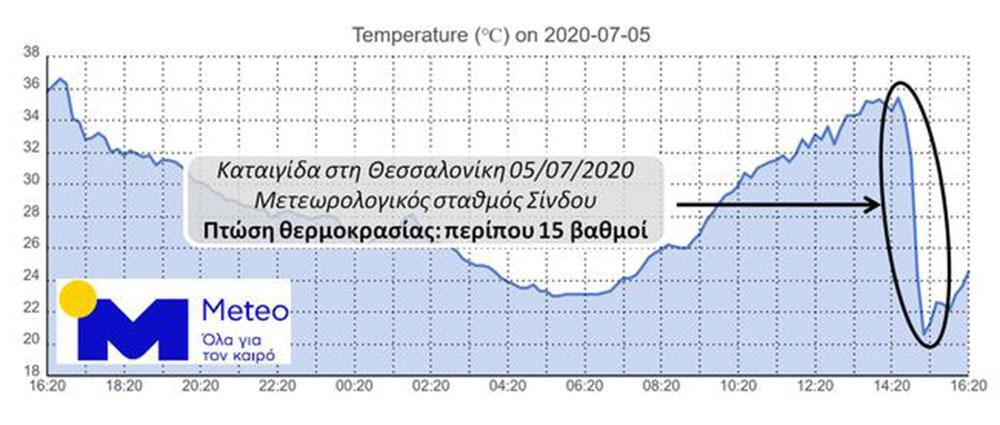 Εντυπωσιακή ήταν η πτώση της θερμοκρασίας κατά τη διάρκεια του φαινομένου. Όπως φαίνεται χαρακτηριστικά στο γράφημα που ακολουθεί, η πτώση της θερμοκρασίας στη Σίνδο πλησίασε τους 15 βαθμούς σε 40 μόλις λεπτά. Στον ίδιο σταθμό καταγράφηκε ριπή ανέμου ίση με 84 χλμ/ώρα στις 14:56, λίγα λεπτά πριν την έναρξη της βροχόπτωσης.