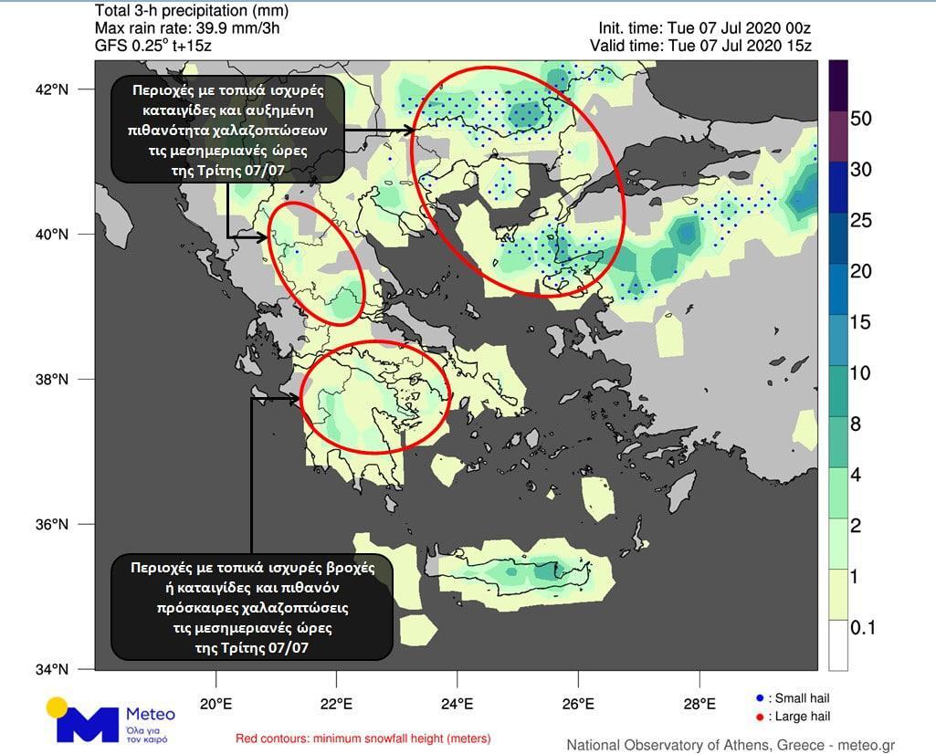 Στον προγνωστικό χάρτη από το Meteo που ακολουθεί αποτυπώνονται οι εκτιμώμενες βροχοπτώσεις κατά το διάστημα 14:00 – 17:00 καθώς και οι περιοχές όπου εκτιμάται ότι θα εκδηλωθούν χαλαζοπτώσεις.