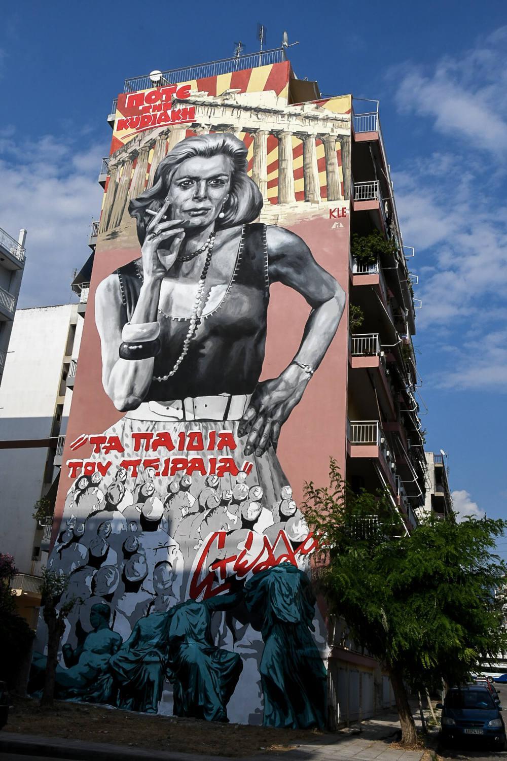 Στην εντυπωσιακή δημιουργία απεικονίζεται η Μελίνα Μερκούρη με φόντο τον Παρθενώνα ενώ η εικόνα συμπληρώνεται από τον τίτλο της εμβληματικής ταινίας με πρωταγωνίστρια την Μελίνα «Ποτέ την Κυριακή» και το τραγούδι «Τα παιδιά του Πειραιά».