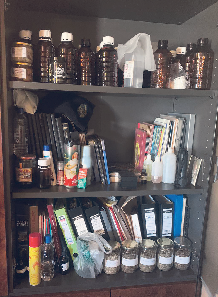 Στο φωτογραφικό ντοκουμέντο που δημοσιοποιεί ο «Ελεύθερος Τύπος», ανάμεσα στα γιατροσόφια, βοτάνια και δήθεν θαυματουργά αποστάγματα, ο 47χρονος είχε το… υγραέριο για τον αναπτήρα, βενζίνη, υγρά για… φακούς επαφής, απιονισμένο νερό για… ηλεκτρικό σίδερο.