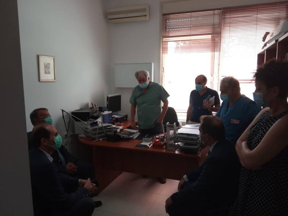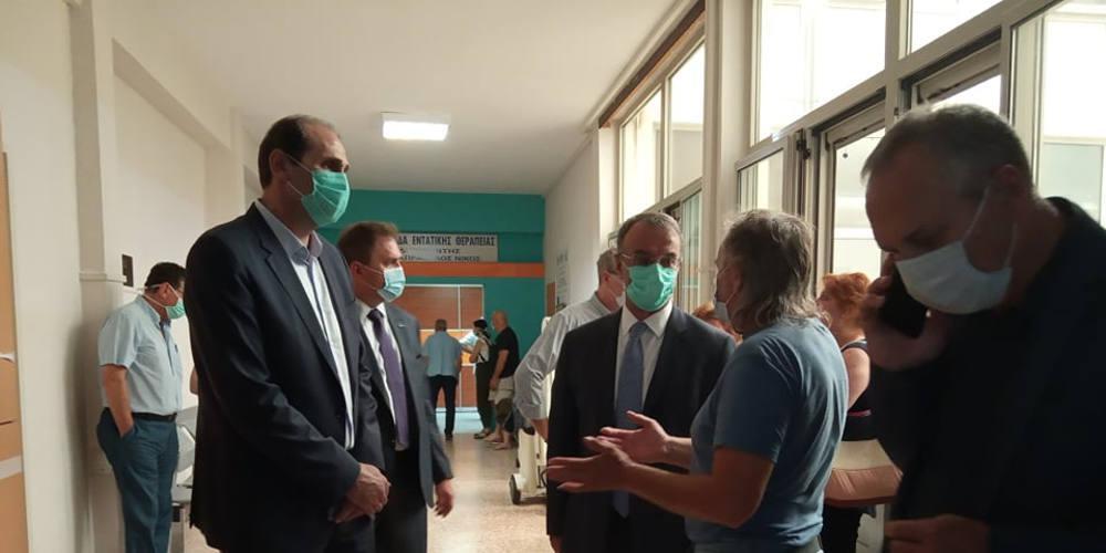 Κατά την επίσκεψη του στη Β ΜΕΘ ενημερώθηκε από τον Διευθυντή Ιατρικής Υπηρεσίας, κ. Γεώργιο Δρόσο, το Διευθυντή της Μονάδας κ. Νικόλαο Καπραβέλο και τον κ. θωμά Σιώζο, νευροχειρουργό. Παρόντες στην χαμηλών τόνων επίσκεψη του υπουργού ήταν εκπρόσωποι των εργαζομένων από το Υπουργείο Οικονομικών.
