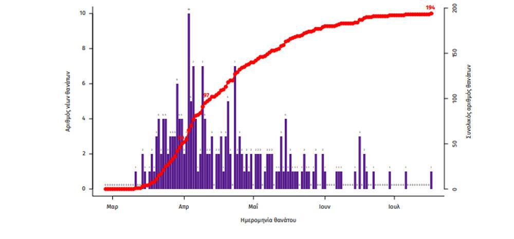 Τέλος, έχουμε 1 ακόμα καταγεγραμμένους θανάτους και 194 θανάτους συνολικά στη χώρα. 63 (32.5%) γυναίκες και οι υπόλοιποι άνδρες. Η διάμεση ηλικία των θανόντων συμπολιτών μας ήταν τα 76 έτη και το 95.9% είχε κάποιο υποκείμενο νόσημα ή/και ηλικία 70 ετών και άνω.