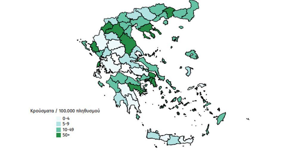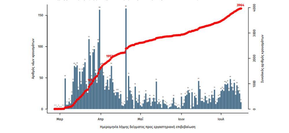 1085 (27.4%) θεωρούνται σχετιζόμενα με ταξίδι από το εξωτερικό και 2035 (51.3%) είναι σχετιζόμενα με ήδη γνωστό κρούσμα.