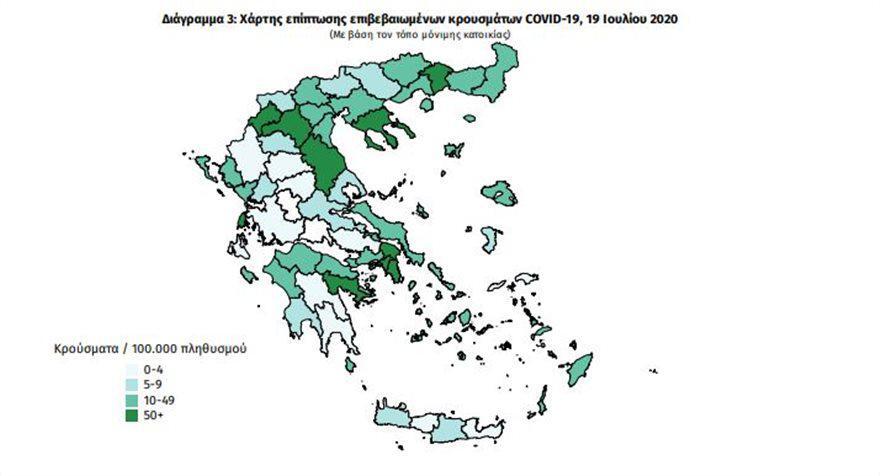 Την Κυριακή ανακοινώθηκαν από τον ΕΟΔΥ 24 νέα κρούσματα του νέου ιού στη χώρα, εκ των οποίων τα 16 εντοπίστηκαν κατόπιν ελέγχων στις πύλες εισόδου τις χώρας. Ο συνολικός αριθμός των κρουσμάτων είναι 4007, εκ των οποίων το 54.7% άνδρες αφορά άνδρες.