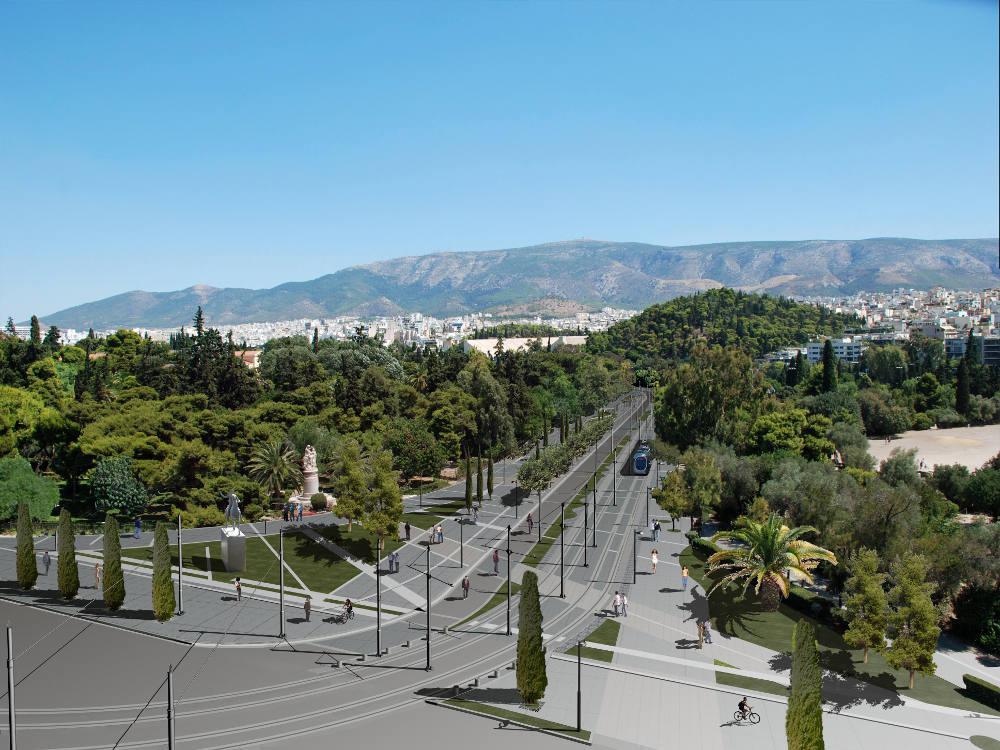 • Οι γραμμές ανόδου και καθόδου του Τραμ από και προς το Σύνταγμα. Η λωρίδα καθόδου, που θα χρησιμοποιείται επίσης για την είσοδο και έξοδο Ε.Ι.Χ. αυτοκινήτων προς και από τον Όμιλο Αντισφαιρίσεως Αθηνών και για τη διέλευση οχημάτων κοινής ωφέλειας.