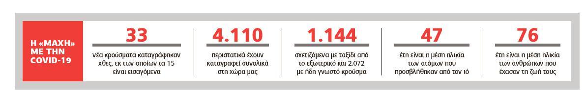 Χθες ανακοινώθηκαν 33 επιπλέον κρούσματα, εκ των οποίων τα 15 εισαγόμενα, με τον συνολικό αριθμό των κρουσμάτων να φθάνει πλέον τα 4.110. Συγκεκριμένα, 10 κρούσματα διαπιστώθηκαν στους ελέγχους στις πύλες εισόδου της χώρας, 5 εισαγόμενα κρούσματα που προσήλθαν αυτοβούλως για έλεγχο, 11 κρούσματα (πάλι διψήφιο νούμερο) στην περιφερειακή ενότητα Αττικής, 4 κρούσματα στην περιφερειακή ενότητα Θεσσαλονίκης, και από 1 κρούσμα στις περιφερειακές ενότητες Μαγνησίας, Αχαΐας και Ξάνθης. Επίσης σημειώθηκε ένας ακόμα θάνατος, με τον συνολικό αριθμό των θανάτων να ανέρχεται στου 201.