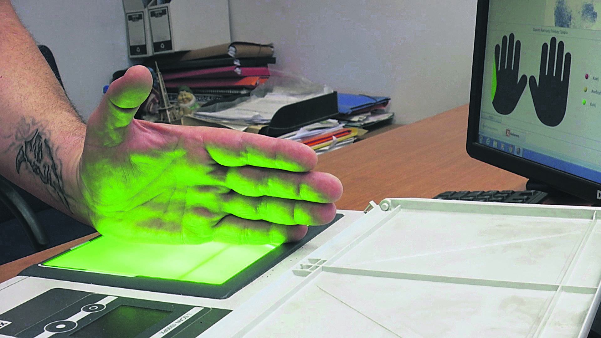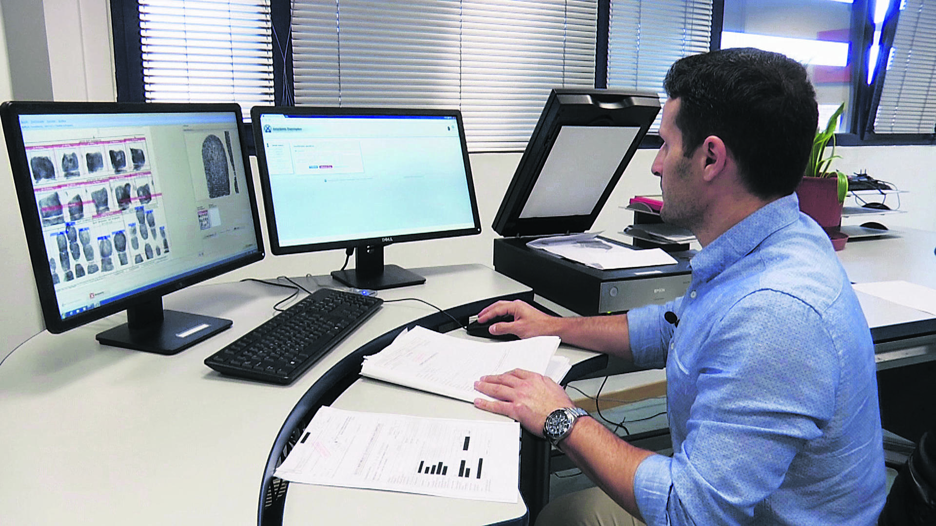 Τον τρόπο ψηφιοποίησης και ταυτοποίησης αποτυπωμάτων εξηγεί ο Αστυνόμος Α’ Παναγιώτης Κοπιτσής: «Παίρνουμε το αποτύπωμα που υπάρχει μέσα στον φάκελό του, το οποίο σκανάρεται σε συγκεκριμένη ανάλυση κατάλληλη για το σύστημα και περνάει ψηφιακά, τραβάει το σύστημα τις εικόνες που θέλει και καταχωρίζει στο σύστημα αναγνώρισης και ταύτισης αποτυπωμάτων που έχουμε, προκειμένου να καταχωριστεί και να αναζητηθεί με τη βάση του. Στέλνει τα αποτυπώματα που βάλαμε εδώ προς τη βάση όλων των λανθανόντων που δεν είχαμε ταυτοποιήσει».