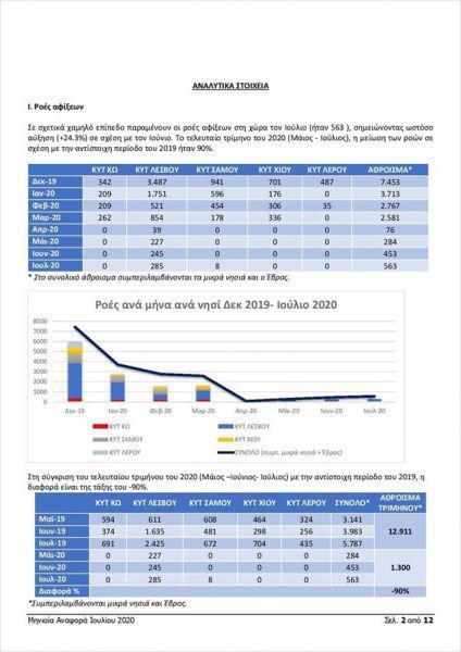 Μείωση κατά 90% παρουσιάζουν το τελευταίο τρίμηνο του 2020 (Μάιος, Ιούνιος, Ιούλιος) οι αφίξεις στα νησιά του Βορείου Αιγαίου, σε σχέση με το αντίστοιχο διάστημα του 2019. Οι μεταφορές στο τελευταίο τρίμηνο του 202, σημείωσαν αύξηση κατά 370% σε σύγκριση με το αντίστοιχο χρονικό διάστημα του 2019, παρά τις δυσκολίες που παρουσιάστηκαν στις μετακινήσεις λόγω της πανδημίας του Covid-19. Συγκεκριμένα, μεταφέρθηκαν 9.929 άτομα τους τελευταίους τρεις μήνες του 2020, όταν πέρυσι στο αντίστοιχο διάστημα μεταφέρθηκαν 2.114.