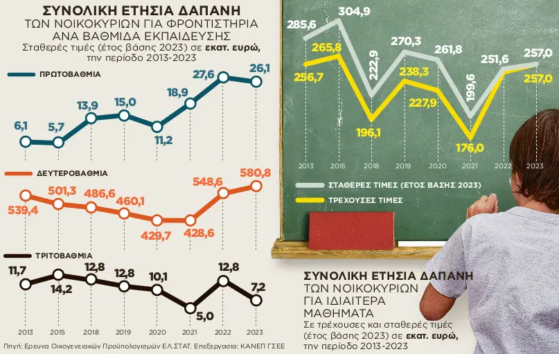 Για το 2023, οι δαπάνες για φροντιστήρια κατανεμήθηκαν ως εξής: το 4,2% αφορούσε την πρωτοβάθμια εκπαίδευση, το 94,6% τη δευτεροβάθμια και το 1,2% την τριτοβάθμια εκπαίδευση. Παρά το γεγονός ότι η πρωτοβάθμια εκπαίδευση απορροφά ένα μικρό κομμάτι σε σχέση με άλλες βαθμίδες, η εξάπλωση των κέντρων μελέτης για μαθητές Δημοτικού, ένα φαινόμενο που άνθισε τα προηγούμενα χρόνια, εκτόξευσε σε απόλυτους αριθμούς τις δαπάνες. Ειδικότερα, το 2013, οι δαπάνες για εξωσχολική υποστήριξη δεν ξεπερνούσαν τα 6,1 εκατ. ευρώ. Το 2023, το αντίστοιχο ποσό εκτοξεύτηκε στα 26,1 εκατ. ευρώ. Μόνο τη διετία 2021-2023, η δαπάνη για την πρωτοβάθμια εκπαίδευση αυξήθηκε κατά 38%.