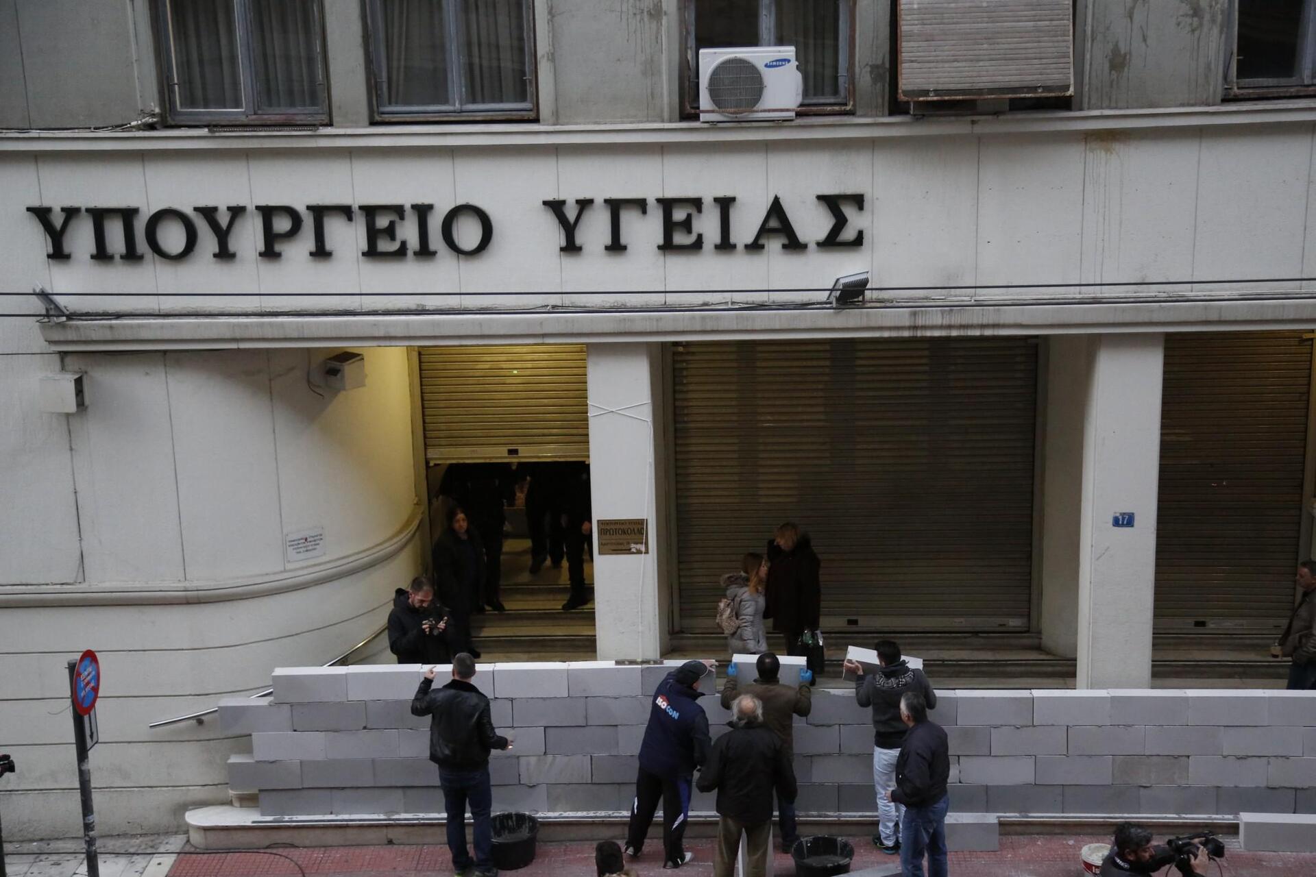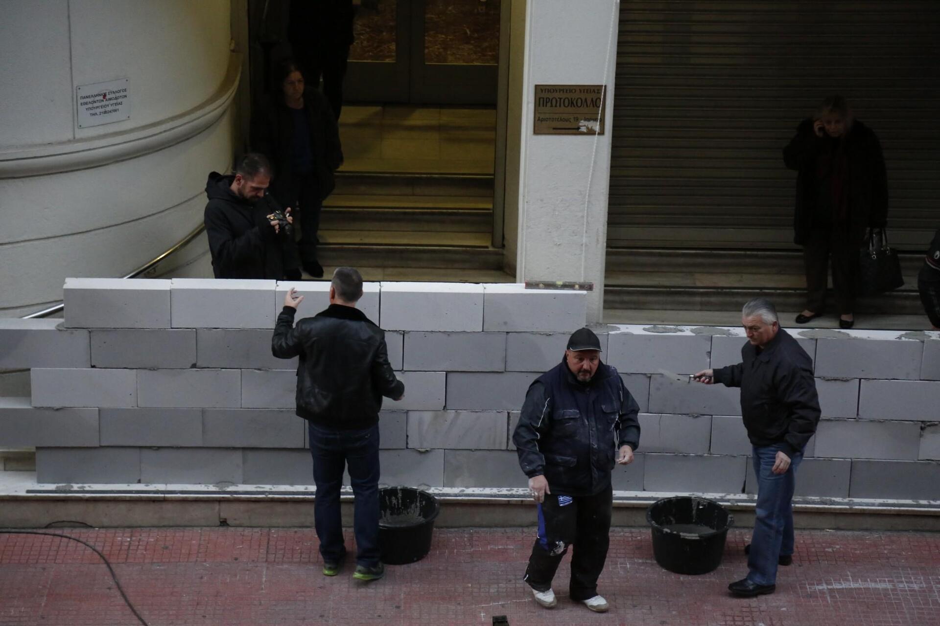 Μέλη της ΠΟΕΔΗΝ πήραν καλέμι και μυστρί και άρχισαν να χτίζουν την είσοδο του κτηρίου της οδού Αριστοτέλους επιχείρηση που ολοκληρώθηκε λίγο πριν τις 8.
