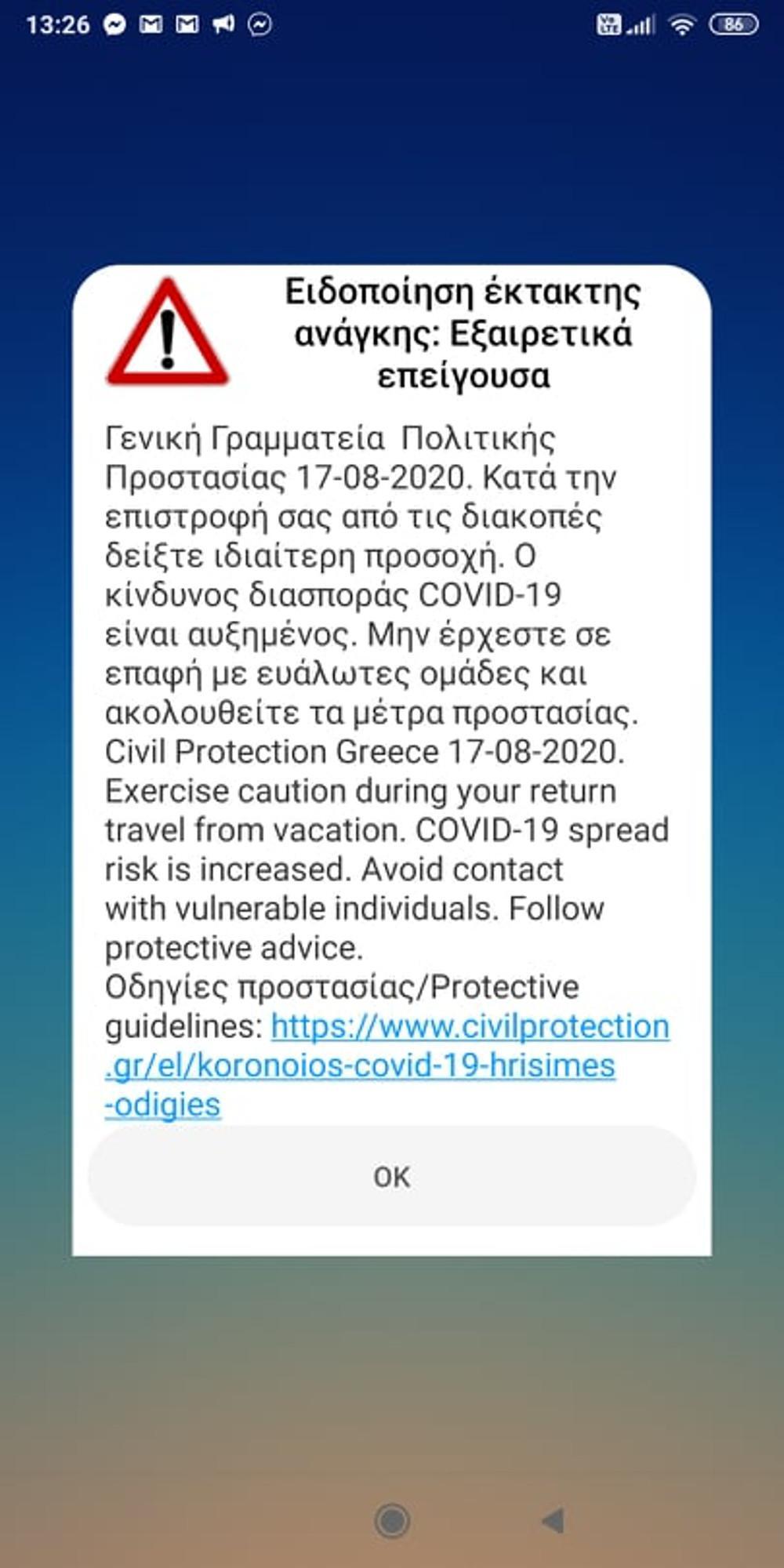 Το μήνυμα εστάλη σε όλη την Ελλάδα και αναφέρει: «Κατά την επιστροφή σας από τις διακοπές δείξτε ιδιαίτερη προσοχή. Ο κίνδυνος διασποράς COVD-19 είναι αυξημένος. Μην έρχεστε σε επαφή με ευάλωτες ομάδες και ακολουθείτε τα μέτρα προστασίας».