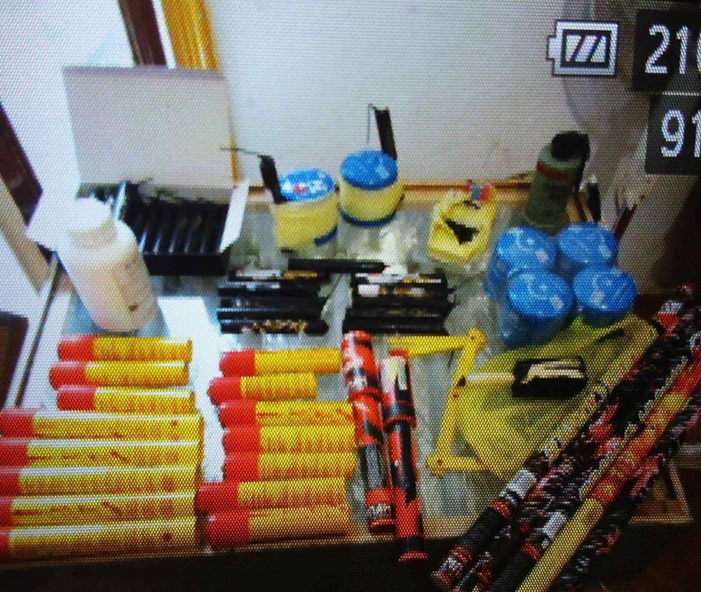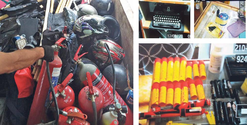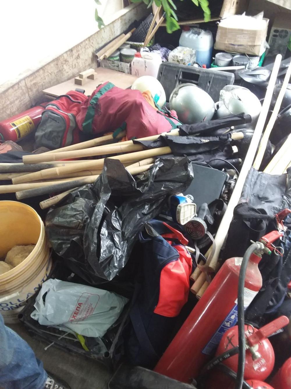 Στους χώρους του κτιρίου βρέθηκε ένα μικρό οπλοστάσιο, όπως: αυτοσχέδιοι εκρηκτικοί μηχανισμοί, γκαζάκια τυλιγμένα με φυτίλια και πλάκες παραφίνης, πλήθος από κράνη, πυροσβεστήρες και αντιασφυξιογόνες μάσκες. Επίσης, βρέθηκαν και κατασχέθηκαν κροτίδες προσαρμοσμένες σε γκαζάκια, δοχεία με εύφλεκτο υλικό, ξύλινες ασπίδες με εσωτερική χειρολαβή, κοντάρια, ένας σταθερός και ένας φορητός ηλεκτρονικός υπολογιστής, γραφομηχανή παλαιού τύπου, μεγάλου μεγέθους τυπογραφική μηχανή και μηχάνημα κοπής χάρτου, πλαστή αστυνομική ταυτότητα, χρηματικό ποσό 1.500 ευρώ καθώς και βιβλίο οικονομικών συνεισφορών.
