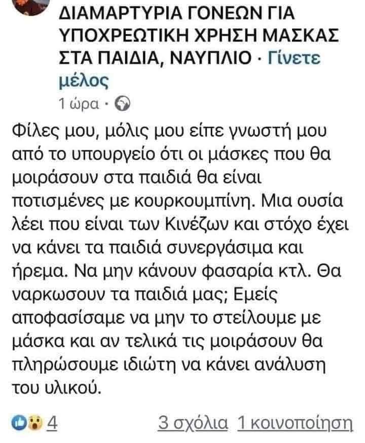 «Φίλες μου, μόλις μου είπε γνωστή μου από το υπουργείο οτι οι μάσκες που θα μοιράσουν στα παιδιά θα είναι ποτισμένες με κουρκουμπίνη. Μια ουσία λέει που είναι των κινέζων και στόχο έχει να κάνει τα παιδιά συνεργάσιμα και ήρεμα. Να μην κάνουν φασαρία κτλ. Θα ναρκώσουν τα παιδιά μας; Εμείς αποφασίσαμε να μην το σχείλουμε με μάσκα και αν τελικά τις μοιράσουν θα πληρώσουμε ιδιώτη να κάνει ανάλυση υλικού».