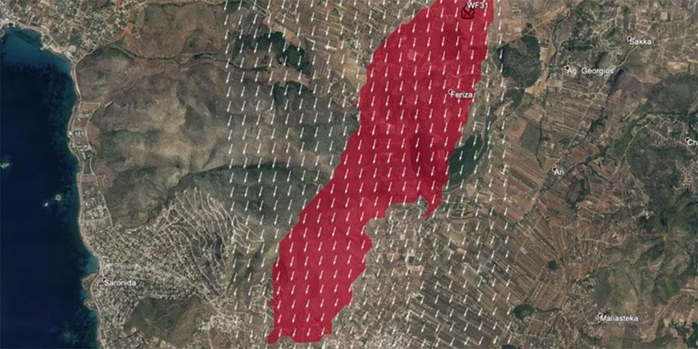 Στο βίντεο, εκτός από την εξάπλωση της πυρκαγιάς, παρουσιάζεται και το πεδίο του ανέμου (λευκά βέλη).