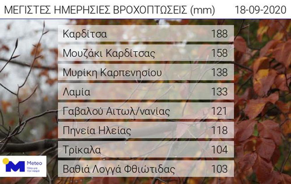 Σήμερα, στο πρώτο μισό του Σαββάτου, η περισσότερη βροχή φαίνεται να έχει πέσει στο Πολύδροσο Φωκίδας (96 χιλιοστά), στη Σέττα Ευβοίας (95), στην Αμφίκλεια (80) και στο Καρπενήσι (75).