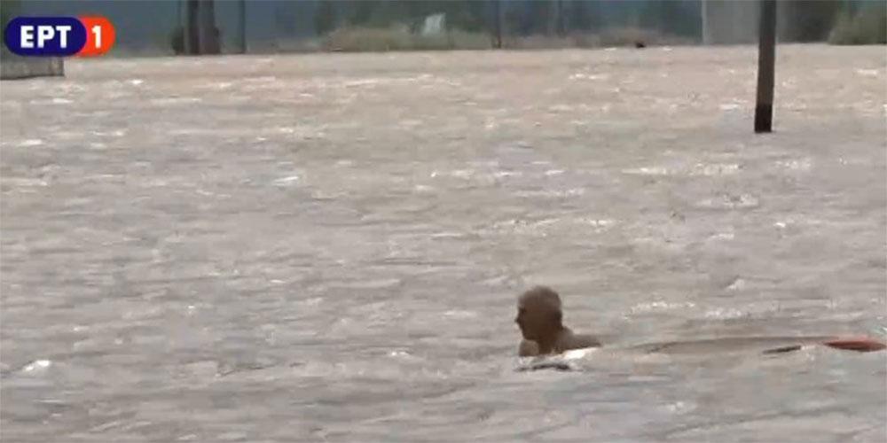 Ο άνδρας είχε εγκλωβιστεί στο σημείο λόγω των πλημμυρικών φαινομένων που έχουν πλήξει την ευρύτερη περιοχή από χθες και αναγκάστηκε να ανέβει πάνω στο καπό του οχήματός του για να μην τον παρασύρουν τα ορμητικά νερά.