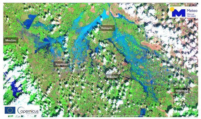 Η επόμενη εικόνα δείχνει τις πλημμυρισμένες εκτάσεις του Νομού Καρδίτσας την Κυριακή 20 Σεπτεμβρίου 2020 όπως τις κατέγραψε ο ευρωπαϊκός δορυφόρος Sentinel-2, περίπου δύο ημέρες μετά τα ακραία καιρικά φαινόμενα αφότου ένα μέρος των υδάτων είχε ήδη υποχωρήσει.