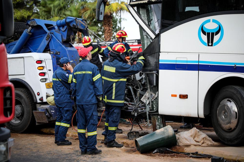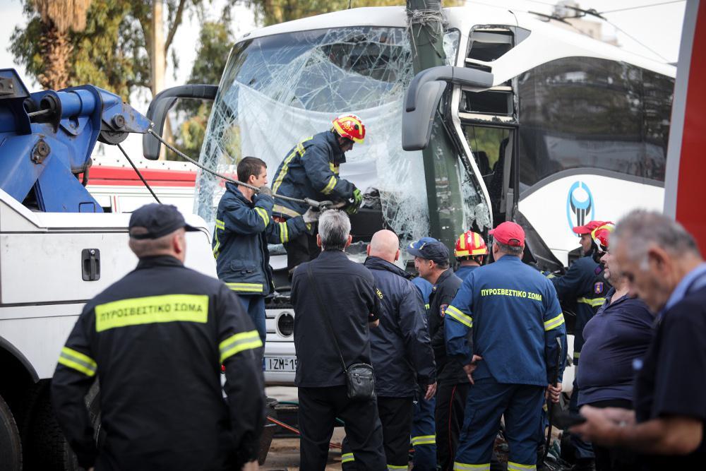Πιθανώς λόγω της ολισθηρότητας του οδοστρώματος, το λεωφορείο προσέκρουσε στην κολόνα, με αποτέλεσμα να υποστεί τεράστιες ζημιές στο μπροστινό μέρος, ενώ ο οδηγός εγκλωβίστηκε στο πούλμαν.