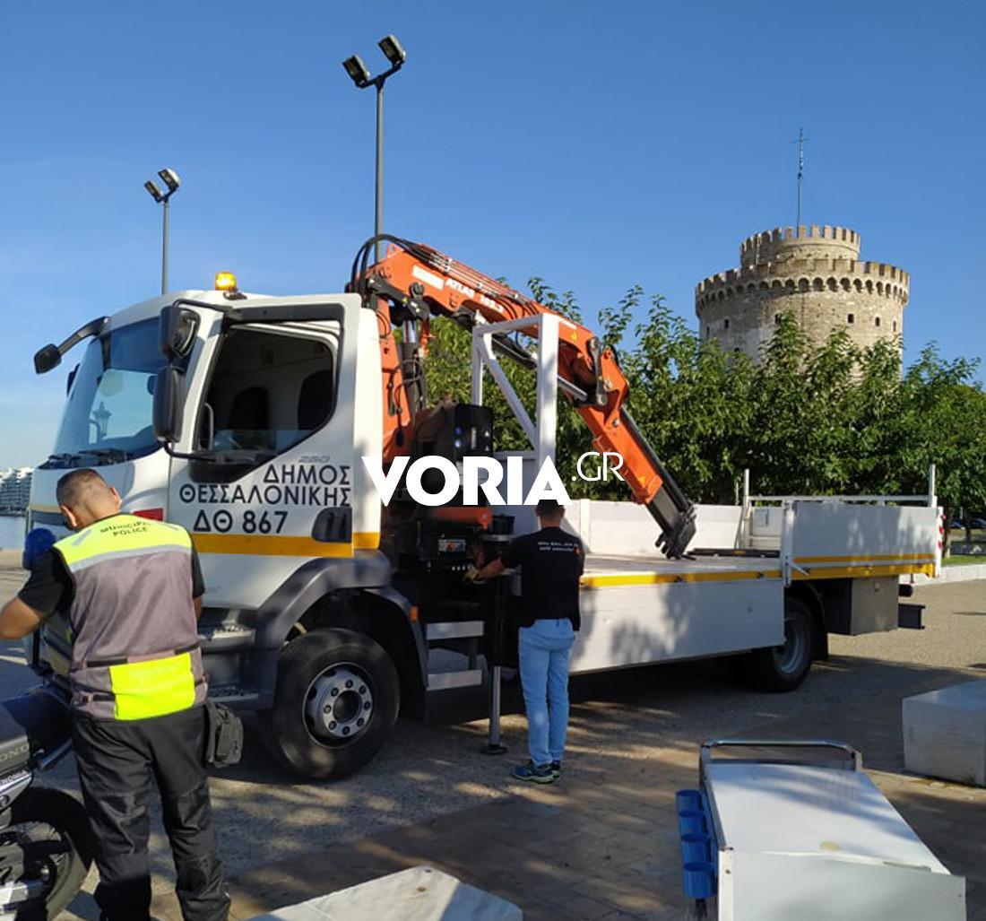 Με γερανό από τη Διεύθυνση Καθαριότητας απομακρύνθηκαν οι παράνομοι πάγκοι, τους οποίους αφήνουν οι μικροπωλητές την ημέρα, προκειμένου να τους επαναλειτουργήσουν από το απόγευμα, όπου ο κόσμος βγαίνει για βόλτα στην παραλία.