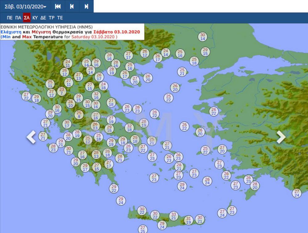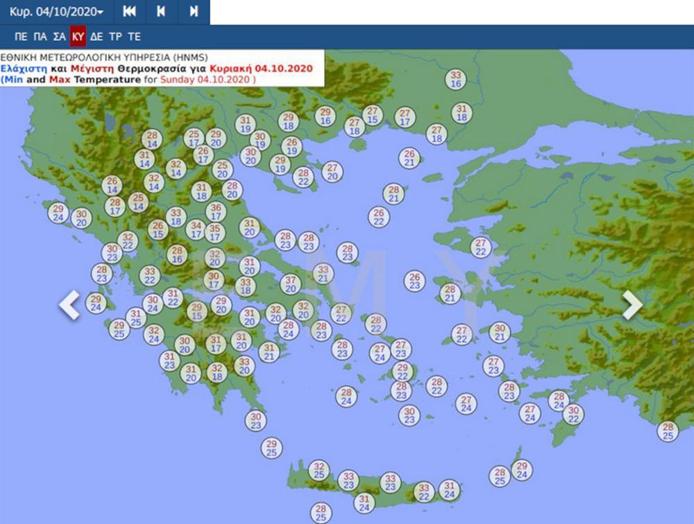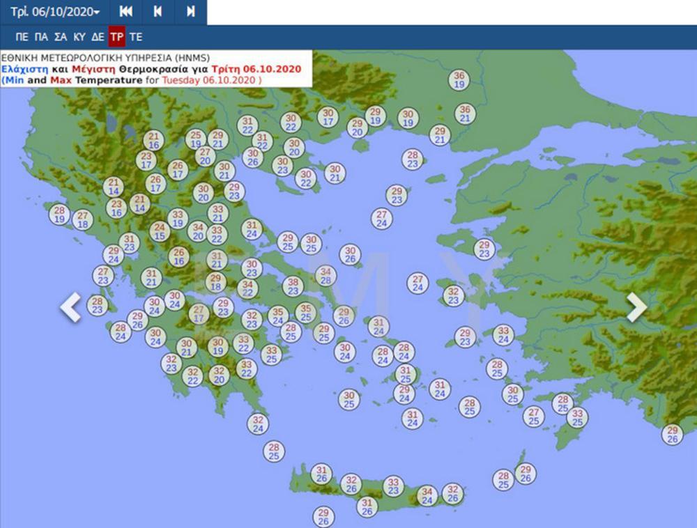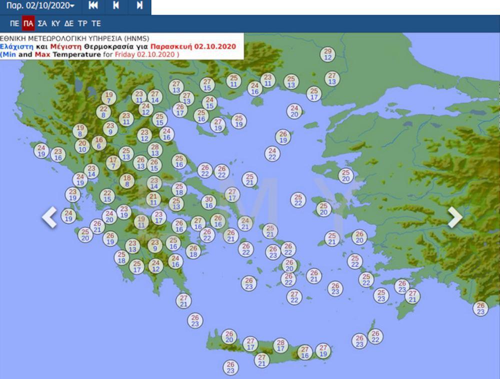 Ειδικότερα, ο συνδυασμός ενός βαθέως βαρομετρικού χαμηλού στη Βορειοδυτική Ευρώπη με τις υψηλές πιέσεις στην Ανατολική Μεσόγειο κατά τις επόμενες ημέρες, θα προκαλέσει την επικράτηση νοτιοδυτικής ροής στην ατμόσφαιρα και τη μεταφορά θερμών αερίων μαζών προς τη χώρα μας. Ως αποτέλεσμα η θερμοκρασία θα παρουσιάσει σταδιακή άνοδο, η οποία θα αρχίσει να γίνεται αισθητή από την Παρασκευή 2 Οκτωβρίου 2020.
