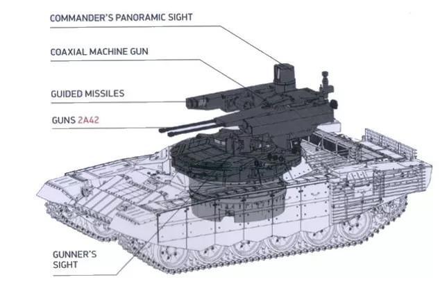 Τα πυροβόλα τροφοδοτούνται από δύο ανεξάρτητους ταινιόδρομους επί του πυργίσκου που βρίσκονται υπό θωράκιση. Κατ’ αυτό τον τρόπο, ακόμη κι αν το όχημα πληγεί στο συγκεκριμένο σημείο, το πλήρωμα δεν κινδυνεύει από τις εκρήξεις των πυρομαχικών. Τα πυροβόλα 2Α42 είναι τοποθετημένα σε παράλληλη σειρά επί του τηλεχειριζόμενου πυργίσκου, ενώ το συζυγές πολυβόλο των 7,62 χλστ. με απόθεμα 2000 βλημάτων είναι τοποθετημένο στο ανώτερο σημείο του πυργίσκου, ακριβώς στη μέση μεταξύ των δύο κυρίων πυροβόλων.