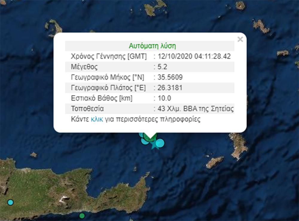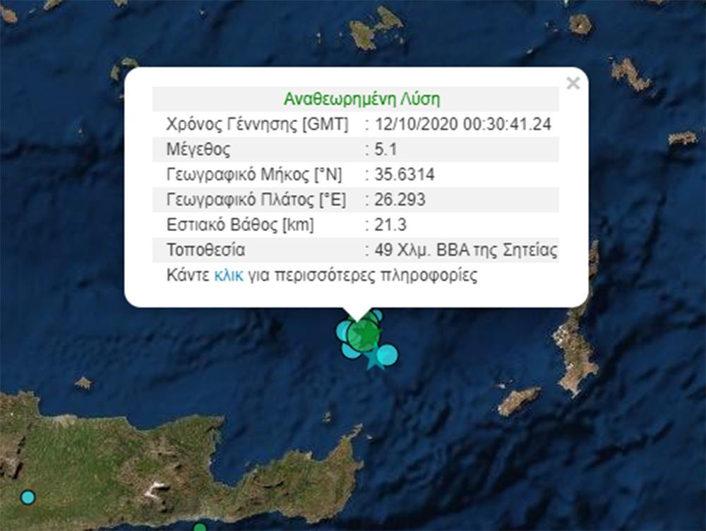 Σύμφωνα με το Γεωδυναμικό Ινστιτούτο Αθηνών, ο σεισμός σημειώθηκε στις 03:35 τα ξημερώματα της Δευτέρας και είχε επίκεντρο 49 χιλιόμετρα βορειοανατολικά της Σητείας.