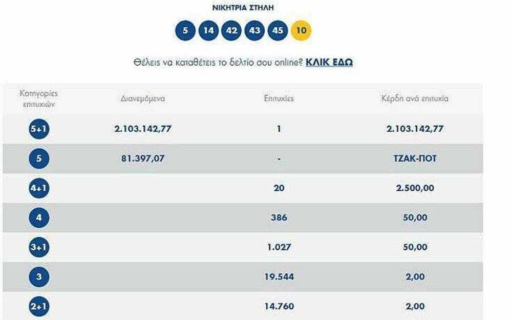 Οι τυχεροί αριθμοί ήταν: 5, 14, 42, 43, 45 και Τζόκερ ο αριθμός 10.
