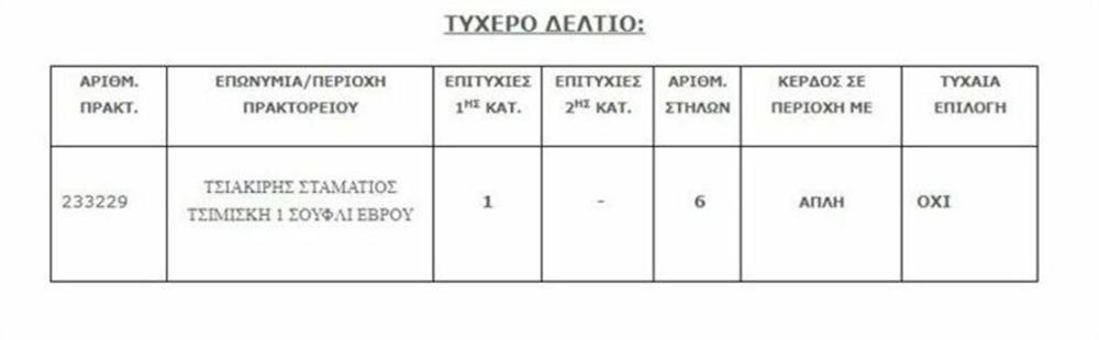 Επίσης στη 2η κατηγορία (5άρια) σημειώθηκε τζακ-ποτ και το ποσό των 81.397,07 ευρώ μεταφέρεται στην ίδια κατηγορία της επόμενης κλήρωσης.