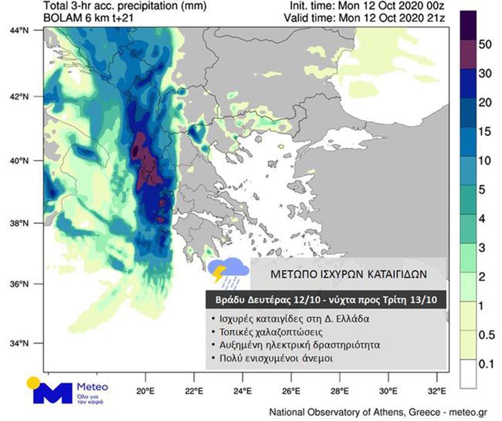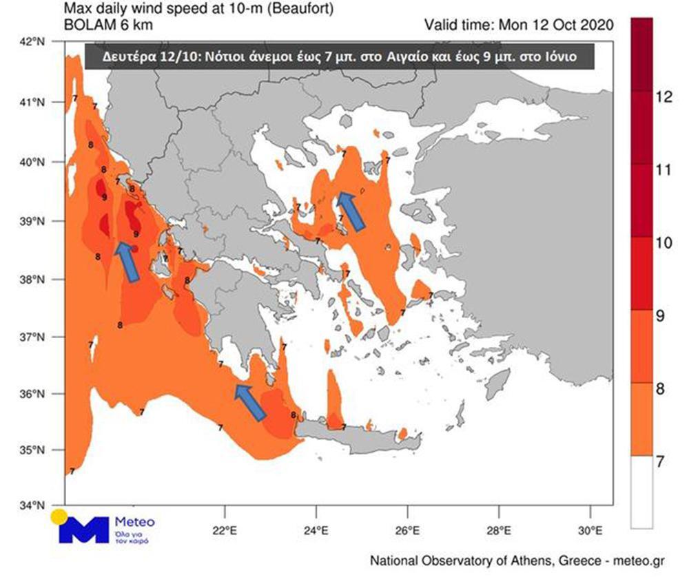 Από το απόγευμα της Δευτέρας (12-10-2020) και μέχρι το απόγευμα της Τρίτης (13-10-2020) αναμένονται στη χώρα από τα δυτικά, ισχυρές βροχές και καταιγίδες που θα συνοδεύονται από χαλαζοπτώσεις και τους θυελλώδεις νότιους ανέμους εντάσεως 7 με 8 μποφόρ, οι οποίοι την Τρίτη θα φτάσουν στο βόρειο Αιγαίο έως 9 μποφόρ.