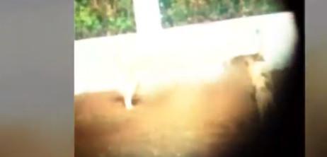 Το βασανιστήριο των ζώων δεν έχει τέλος. Η γυναίκα βγαίνει και πάλι έξω και αρχίζει να κυνηγά ξανά τους σκύλους με το ξύλο και να τους χτυπά.