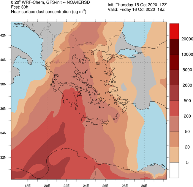 Επιπροσθέτως, όπως φαίνεται στο χάρτη που ακολουθεί, αυξημένες θα είναι οι συγκεντρώσεις Αφρικανικής σκόνης σε πολλές περιοχές της χώρας, ενώ άνεμοι νοτίων διευθύνσεων με εντάσεις έως 6 μποφόρ θα πνέουν στο Αιγαίο και έως 7 μποφόρ στο Ιόνιο.