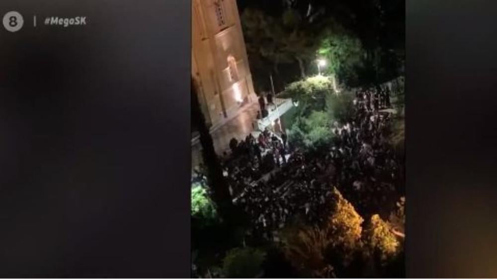 Ειδικότερα, όπως φαίνεται και στο βίντεο, δεκάδες νέων συγκεντρώθηκαν μετά τα μεσάνυχτα στον υπαίθριο χώρο της εκκλησίας, συνεχίζοντας τη… βραδινή τους έξοδο μιας και πλέον τα μαγαζιά κλείνουν στις 12. Χωρίς, φυσικά, να τηρείται κανένα μέτρο, οι παρευρισκόμενοι κάθονταν στα σκαλιά της εκκλησίας, ενώ συνεχώς κατέφθαναν ολοένα και περισσότεροι.
