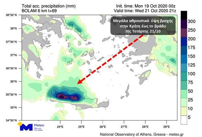 Επισημαίνεται ότι, από τις βραδινές ώρες της Τρίτης 20/10 ο καιρός στο Νότιο Αιγαίο θα παρουσιάσει σημαντική επιδείνωση με ισχυρές βροχές και καταιγίδες, φαινόμενα τα οποία στην Κρήτη αναμένεται να επιμείνουν έως τις πρωινές ώρες της Πέμπτης 22/10 δίνοντας πολύ μεγάλα ύψη βροχόπτωσης, όπως φαίνεται στον προγνωστικό χάρτη που ακολουθεί.