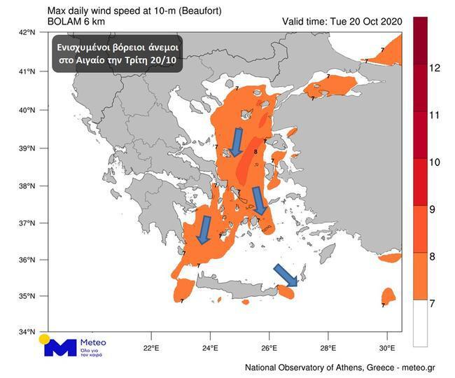 Οι εντάσεις των βοριάδων στο Αιγαίο το διήμερο Τρίτη 20/10 και Τετάρτη 21/10 θα φτάνουν τοπικά τα 8 μποφόρ. Στο χάρτη που ακολουθεί παρουσιάζονται οι περιοχές όπου οι βόρειοι άνεμοι κατά τη διάρκεια της Τρίτης 20/10 θα πνέουν με εντάσεις έως 7 και τοπικά 8 μποφόρ.