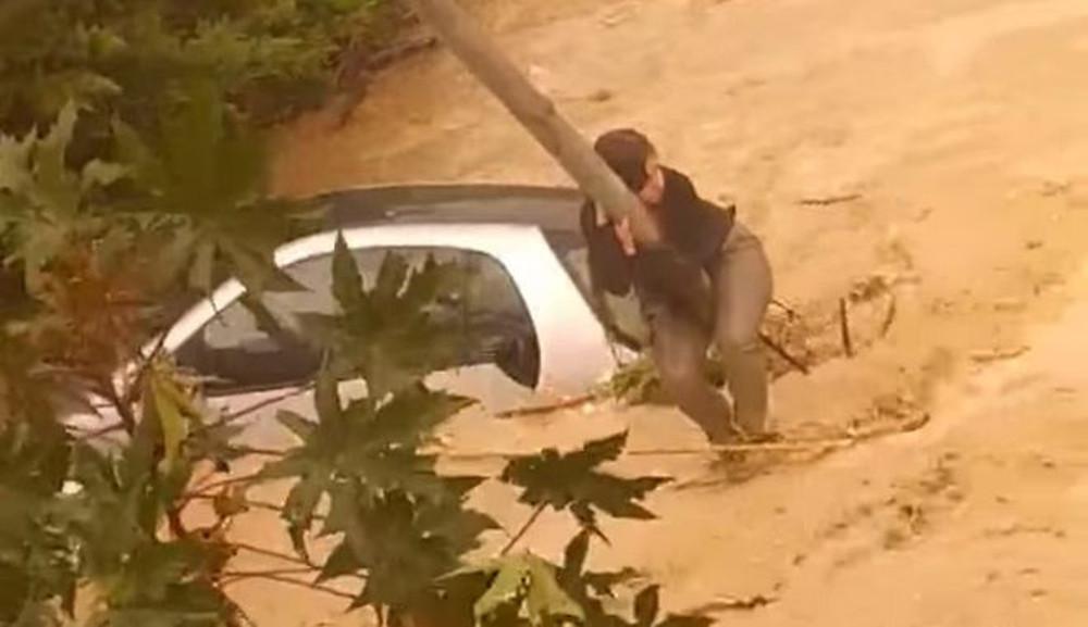 Η νεαρή οδηγός κατόρθωσε να βγει από το αυτοκίνητό της και να … σκαρφαλώσει σε έναν στύλο της ΔΕΗ, προκειμένου να μην παρασυρθεί από τον χείμαρρο που παράσερνε τα πάντα στο πέρασμα του.