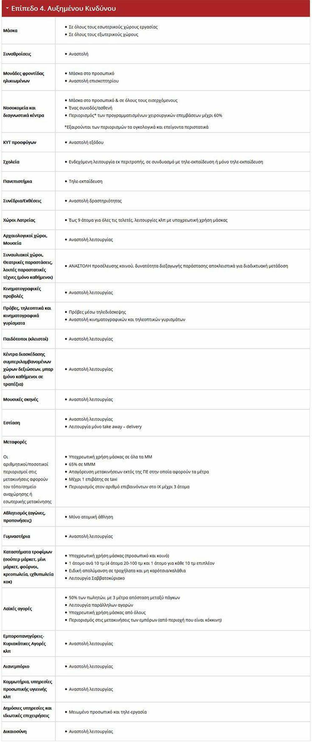 Σε σχέση με τη λειτουργία των ακολούθων: Δημόσιες Υπηρεσίες, Ιδιωτικές Επιχειρήσεις, Μεταφορές, Καταστήματα τροφίμων (π.χ. σούπερ μάρκετ, μίνι μάρκετ, φούρνοι, κρεοπωλεία, ιχθυοπωλεία), Λαϊκές Αγορές, Χώροι Λατρείας/Θρησκευτικές Τελετές, Νοσοκομεία, Ιατρεία, Διαγνωστικά Κέντρα, Μονάδες φροντίδας ηλικιωμένων, κέντρα χρονίως πασχόντων, δομές και ξενώνες φιλοξενίας ευπαθών ομάδων, ξενώνες μεταβατικής φιλοξενίας αστέγων, κοινωνικές δομές άμεσης αντιμετώπισης της φτώχειας (υπνωτήρια, κέντρα ημέρας, κοινωνικά παντοπωλεία, κοινωνικά φαρμακεία, συσσίτια), δομές παιδικής προστασίας και κέντρα κοινότητας, στρατόπεδα, Δραστηριότητες Εκπαίδευσης Οδηγών και Υπηρεσίες Τεχνικού Ελέγχου Οχημάτων, ισχύουν τα προβλεπόμενα στο ΦΕΚ, Τεύχος Β, 4484/11-10-2020.