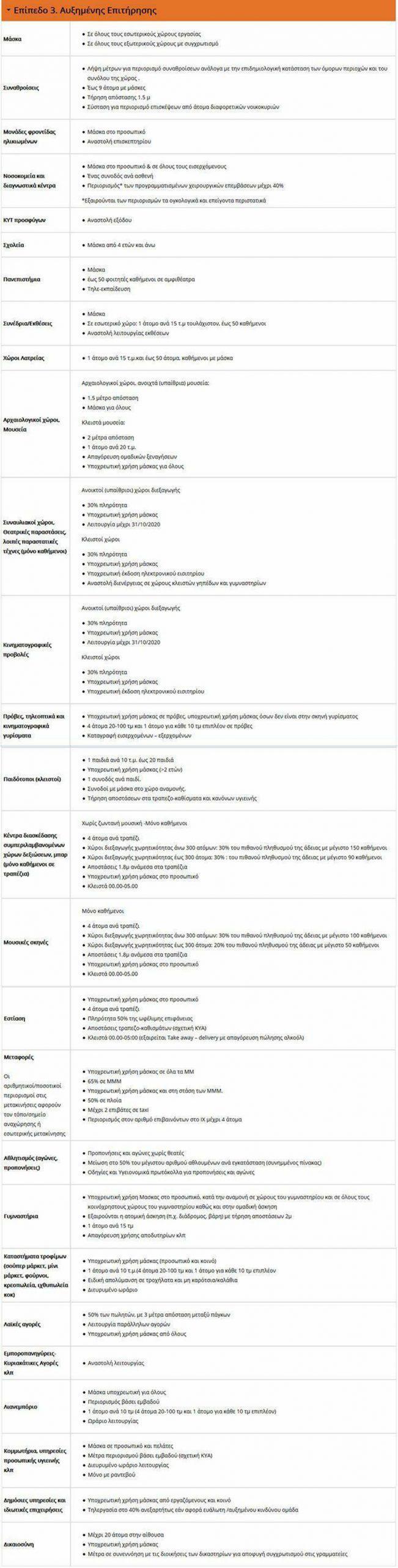 Παράλληλα σημειώνεται ότι για τις περιφερειακές ενότητες που βρίσκονται στο επίπεδο 3 (Αυξημένης Επιτήρησης) και στο επίπεδο 4 (αυξημένου κινδύνου), συνολικά δηλαδή για 26 περιφερειακές ενότητες, από το Σάββατο 24 Οκτωβρίου στις 6 το πρωί, ισχύει απαγόρευση της κυκλοφορίας από τις 12μιση το βράδυ μέχρι τις 5 το πρωί.