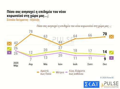Aνήσυχοι για την επιδημία του κορωνοϊού στη χώρα μας δηλώνουν οι επτά στους 10 Έλληνες. Το ποσοστό 70% των ανησυχούντων για το δεύτερο κύμα της επιδημίας στη δημοσκόπηση του Οκτωβρίου είναι το δεύτερο υψηλότερο μετά το 78% του Απριλίου στην έξαρση του πρώτου κύματος.
